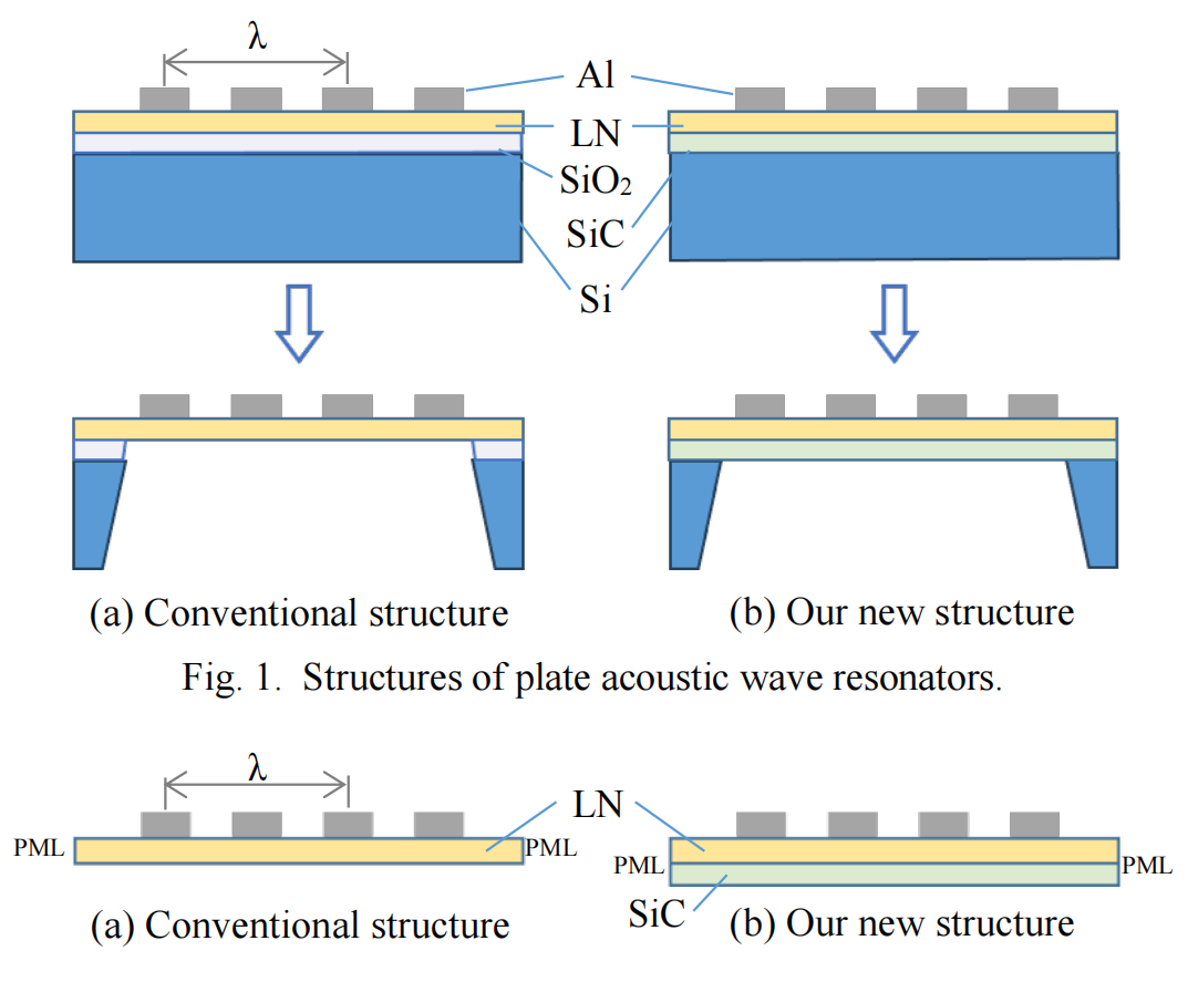 - The study proposes a new PAW resonator structure where a thin layer of silicon carbide (SiC) is bonded to the bottom of a lithium niobate (LiNbO₃, LN) thin film. The SiC layer is intended to enhance the mechanical strength and heat dissipation without significantly compromising performance.
