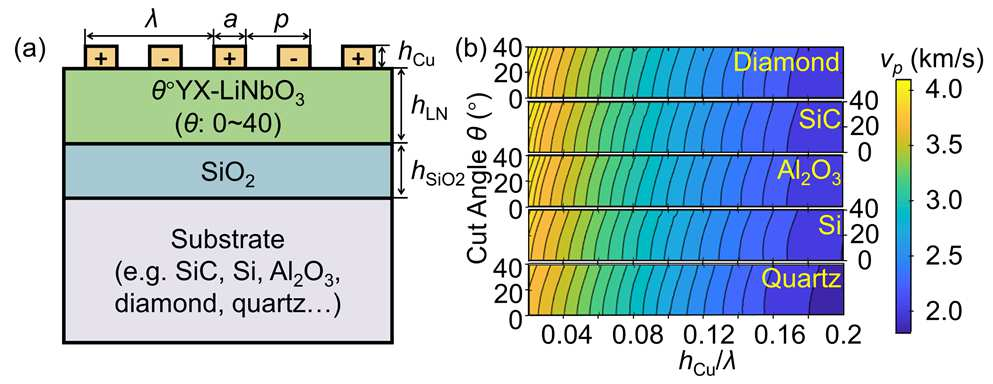 - The authors used finite element method (FEM) simulations to study different substrate materials (SiC, Si, Al₂O₃, diamond, and quartz) and LN cut angles.