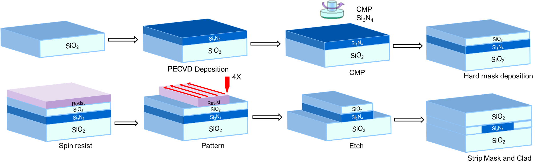 1. **Fabrication Process**: The process utilizes PECVD at 350°C to deposit Si₃N₄ films. Post-processing methods, such as chemical mechanical planarization (CMP) and rapid thermal anneal (RTA), are employed to reduce surface roughness and improve film quality. Surface roughness is decreased from 1.36 nm to 0.20 nm after CMP.