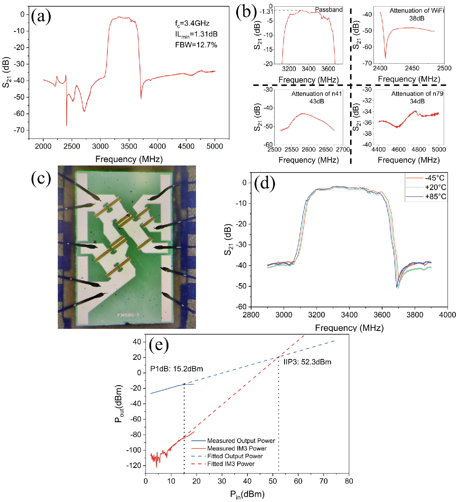 The filter showed a low temperature coefficient of frequency (TCF) of −35.6/−40.2 ppm/°C and exhibited robust performance under high-linearity conditions, with a 1-dB compression point (P1dB) of 15.2 dBm and an input third-order intercept point (IIP3) of 52.3 dBm.