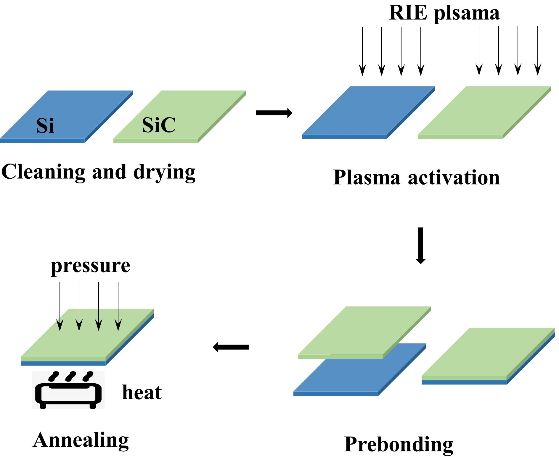 The paper discusses the low-temperature direct bonding of Silicon Carbide (SiC) to Silicon (Si) via plasma activation, specifically using O2 plasma. The primary focus is on optimizing the process parameters for high bonding efficiency and exploring the bonding mechanism. The authors use reactive ion etching (RIE) O2 plasma to activate the bonding surfaces and achieve an over 90% bonding efficiency. Key findings include: