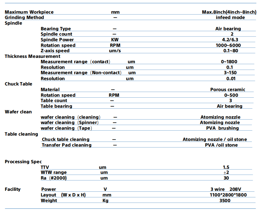 The entire machine is equipped with 2 spindle(6.3kw) axis 3 chuck tables and one turn table. This machine supports various workpieces up to Φ8 inches, including difficult-to-process materials such as Silicon, LT, LN, and SiC.