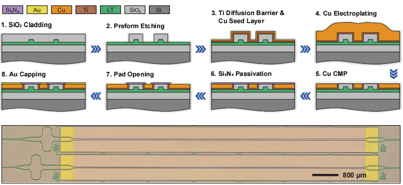 The paper titled "Copper Damascene Process-Based High-Performance Thin Film Lithium Tantalate Modulators" introduces a novel approach for integrating high-performance electro-optic (EO) modulators based on lithium tantalate (LiTaO3) thin films using the copper Damascene process. This technique, typically used in semiconductor manufacturing, allows for the creation of low-loss electrodes and enables efficient chip-on-wafer bonding, which is essential for tight integration with electronics.