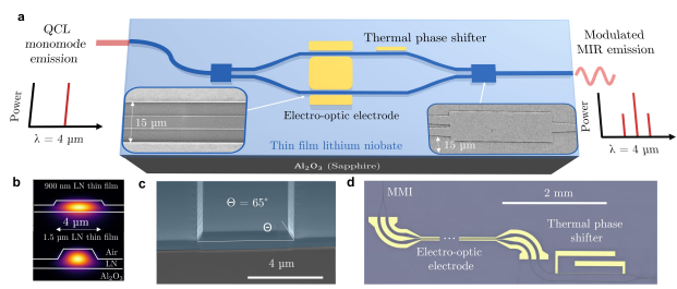 The device uses a Mach–Zehnder interferometer architecture and is based on thin-film lithium niobate (LN) integrated onto sapphire. The integration of high confinement waveguides and thermo-optic electrodes contributes to the device’s excellent performance. Notably, it achieves π-phase modulation in the MIR, a key milestone for integrated photonics.
