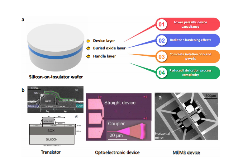 Summary Silicon-on-Insulator (SOI) wafers offer significant advantages in integrated circuits (ICs) and microelectromechanical systems (MEMS) due to their buried oxide (BOX) layer, which improves electrical isolation, reduces parasitic capacitance, and enhances radiation resistance. This paper reviews major fabrication methods and characterization techniques for SOI wafers.