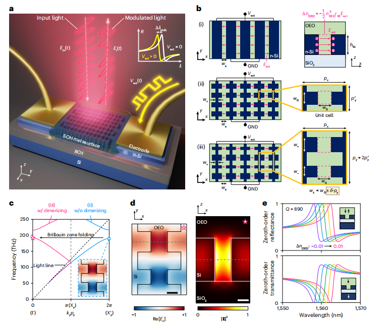 The article presents a subvolt high-speed free-space optical modulator using a silicon-organic-hybrid (SOH) metasurface that operates efficiently at low voltages, enabling fast data transmission at minimal power consumption. The device uses a dimerized-grating nanostructure, which effectively couples light to a high-Q resonant mode within a narrow silicon slot region. By embedding an organic electro-optic (OEO) material, the modulator achieves significant modulation efficiency with a driving voltage as low as 0.2 V, demonstrating data transmission speeds up to 1.6 Gbps.