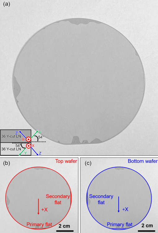 The wafer bonding process of the two 170 µm thick 36°Y-cut LN wafers is described in detail, including surface cleaning, treatment, alignment, and annealing, resulting in a high bonding quality. The resonator is fabricated using standard microfabrication techniques, with Pt electrodes deposited and patterned, and finally integrated onto an FR-4 PCB.