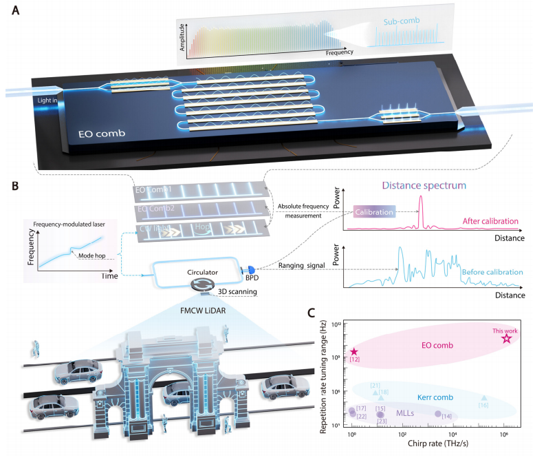 Device Design: The electro-optic comb was designed using phase modulators and an amplitude modulator to create a broadband, flat-top spectrum with a tunable repetition rate. The device enables real-time tracking and calibration of FMLs with various chirp rates.