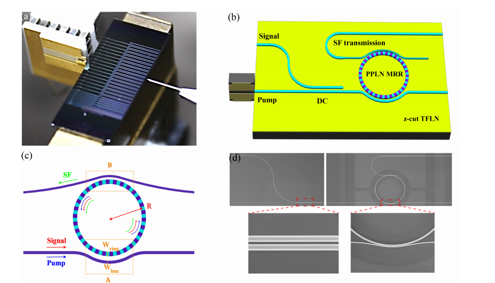 Design and Fabrication: The QFC chip uses a double-pulley add-drop design for the MRR, enabling efficient coupling of signal, pump, and sum-frequency (SF) light, while minimizing noise and enhancing the conversion process. The microring resonator is optimized for triple resonance and high efficiency, with specific coupling parameters tailored for low pump power.