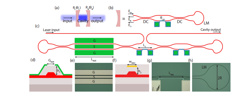 Fabrication Process: The device is fabricated on a TFLN wafer with waveguides and directional couplers (DCs) created using photolithography and dry etching. Thermal tuners are implemented using NiCr heaters, and electro-optic tuning is done using co-planar waveguide (CPW) electrodes.