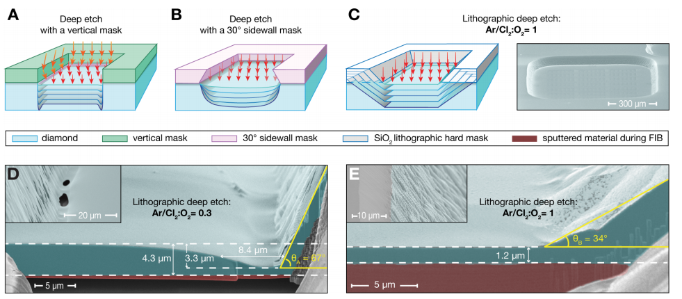 Fabrication Method: The authors present a "lithographic deep etch" (LDE) process that allows the creation of homogeneous, thin (down to 70 nm) diamond membranes. The technique uses a SiO₂ mask, coupled with alternating Ar/Cl₂ and O₂ plasmas, to achieve precise control over etching and minimize the formation of trenches or thickness gradients.