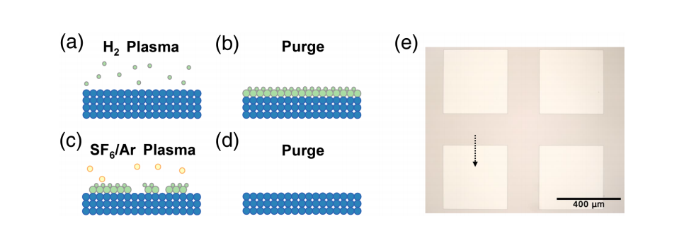 ALE Process Development: The authors present a sequential exposure process using hydrogen (H₂) and SF₆/Ar plasmas for isotropic ALE. The process achieved an etch rate of 1.59 nm/cycle with a synergy of 96.9%. The sequential nature of the process ensures self-limiting etching, which helps smooth the surfaces without significant loss of material, addressing issues such as sidewall roughness.