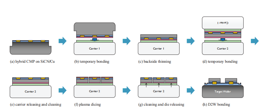 A series of temporary bonding steps are used to handle thin wafers, including thinning the backside to 50 µm and using laser-releasable materials to assist in transferring the dies to the target wafer.