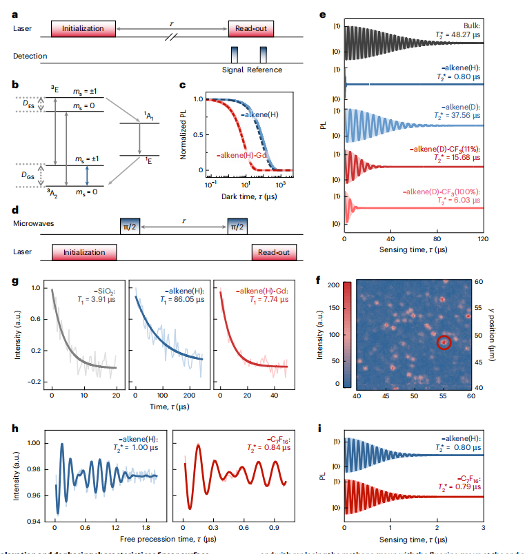 Surface Treatment: The success of the sensor depends on the surface termination of SiC. Alkene modification (CH2=CHC11H23) was found to reduce interface defects significantly compared to conventional oxidation methods. This modification forms a hydrophobic layer that protects the SiC surface from external environmental damage, ensuring stable qubit operation. Furthermore, this surface can be functionalized for specific bioapplications by replacing the alkene groups with hydrophilic functional groups like alcohol.