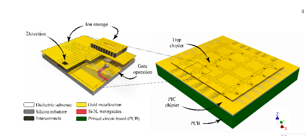 Modular Chiplet Architecture: The chiplet system separates various functionalities into different chiplets. The ion trap is placed on a dielectric substrate, while photonic integrated circuits (PICs) handle optical signal routing and application-specific integrated circuits (ASICs) manage electrical signals. This approach allows for the use of optimal materials and manufacturing technologies for each chiplet, improving overall performance and flexibility.