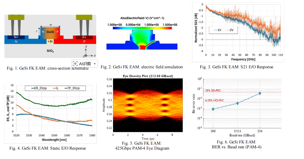 GeSi Franz-Keldish (FK) Electro-Absorption Modulators (EAMs): These modulators exhibit high modulation bandwidth (over 100GHz) and have demonstrated the potential for 400G/lane data transmission in PAM-4 intensity-modulated direct-detection (IMDD) links. The modulator operates with an extinction ratio of around 4 dB and insertion losses ranging from 4 to 8 dB.
