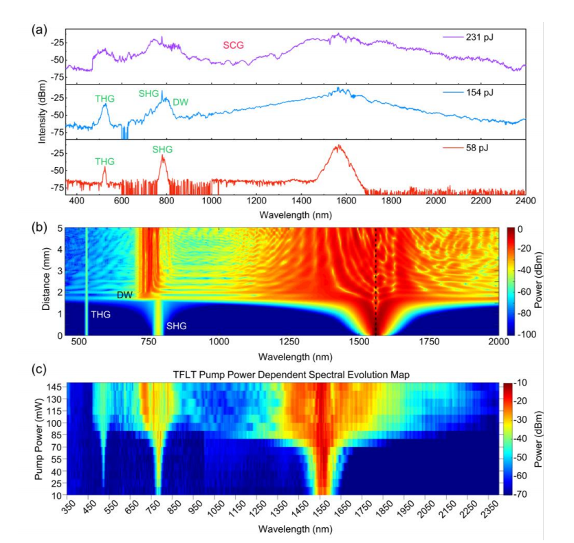 Spectral Evolution: Experimental measurements show a clear spectral evolution with increasing pump power, beginning with phase-matched second-harmonic generation (SHG) and third-harmonic generation (THG). As the pulse energy increases, dispersive waves emerge and eventually coalesce into a broad supercontinuum that spans from the UV to the NIR.