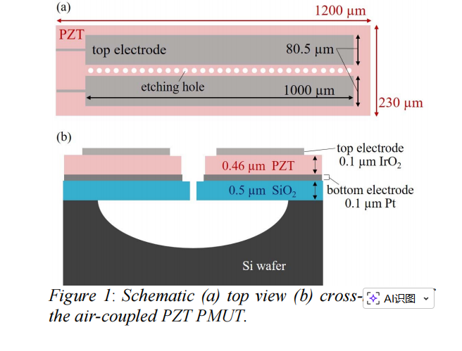 Design and Fabrication: The device uses a ribbon-shaped PMUT, with a rectangular membrane designed to reduce the frequency difference between adjacent working modes. The fabrication involves deposition of PZT and electrode layers, followed by patterning, sacrificial etching, and release processes using XeF2.