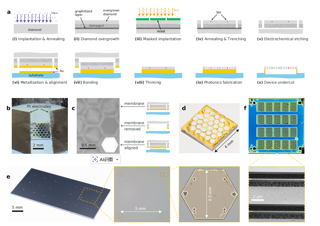Membrane Bonding and Photonic Integration: A key aspect of the fabrication process is the flip-chip thermocompression bonding technique, which allows for the reliable transfer of diamond membranes onto handling chips. This method facilitates the parallel fabrication of many devices on a single chip, paving the way for large-scale production.