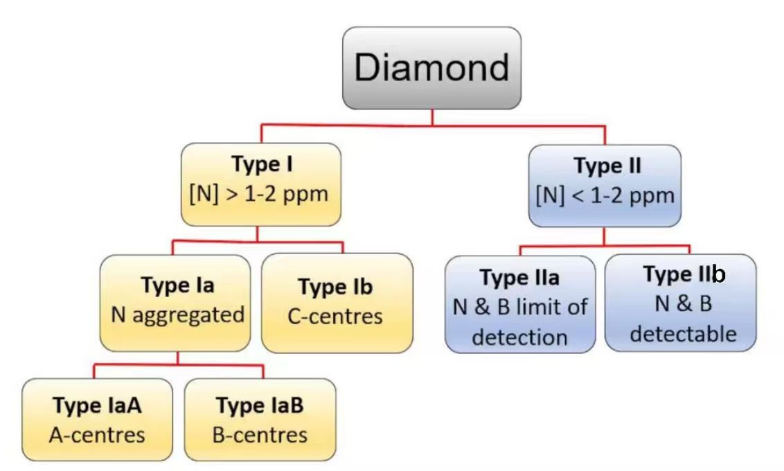 Diamonds can be classified into two major types, Type I and Type II, based on the presence and state of nitrogen impurities in their structure. Type I diamonds are characterized by a high nitrogen content, while Type II diamonds contain little to no nitrogen. Based on the form of nitrogen and other impurity differences, these two types can be further subdivided into Ia, Ib, IIa, and IIb types, as shown in Figure 1.2.