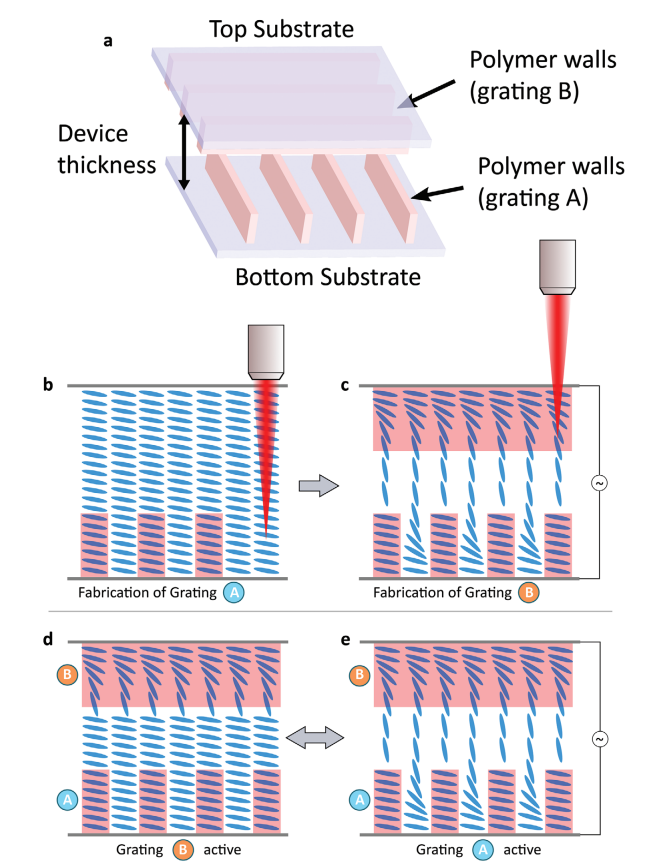 The key innovation is that the optical elements can be switched between two distinct diffraction modes simply by applying different voltages during the fabrication process, enabling multi-element devices to be designed.