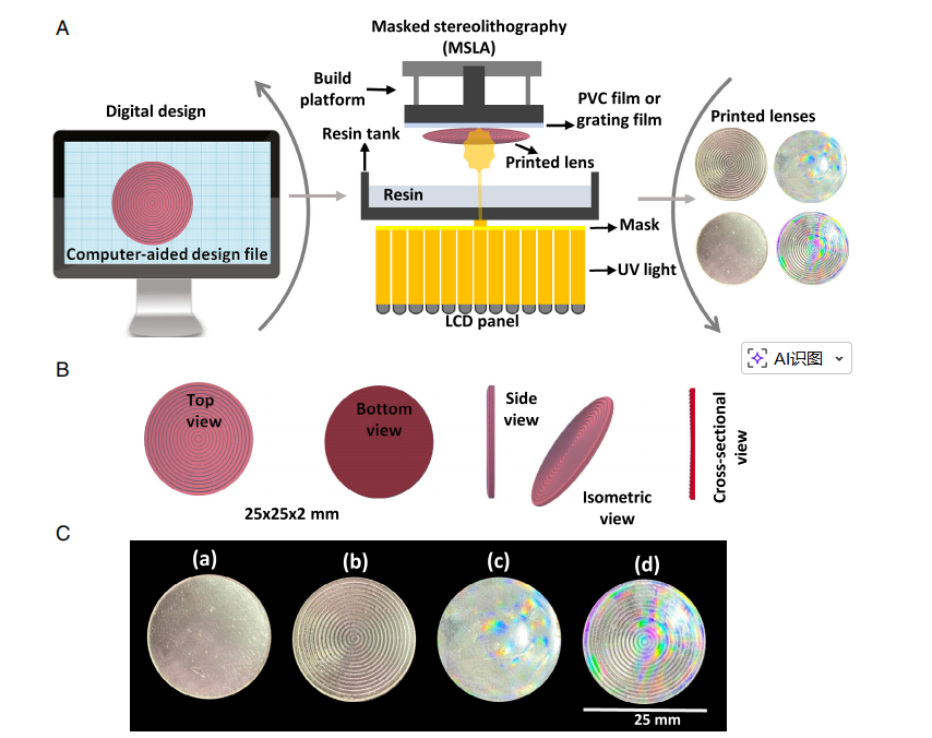 The Fresnel lenses were designed using computer-aided design (CAD) software and fabricated using a 3D printer equipped with MSLA technology. This method enables the creation of fine patterns (5 μm) on the surface of the lenses, leading to their ability to focus light and produce holographic rainbow effects.
