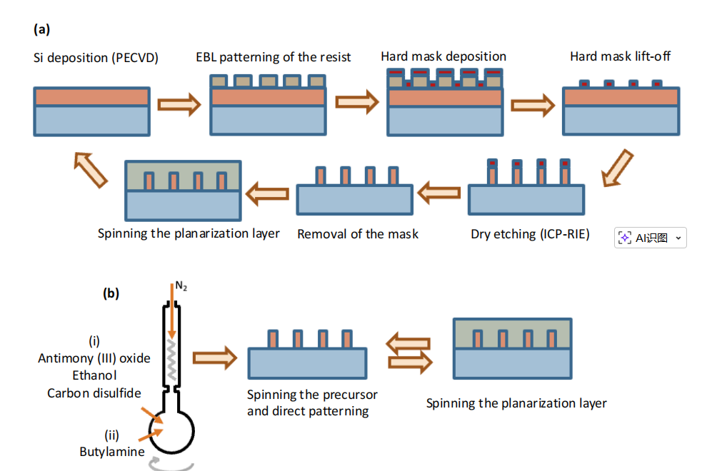 The article presents a direct-write electron-beam lithography method using an antimony precursor, which decomposes in situ to form Sb₂S₃. This method simplifies the process by reducing it to only two steps per layer: spin-coating the precursor and electron-beam patterning. This process eliminates the need for time-consuming deposition, etching, and planarization steps traditionally used in multilayer fabrication.