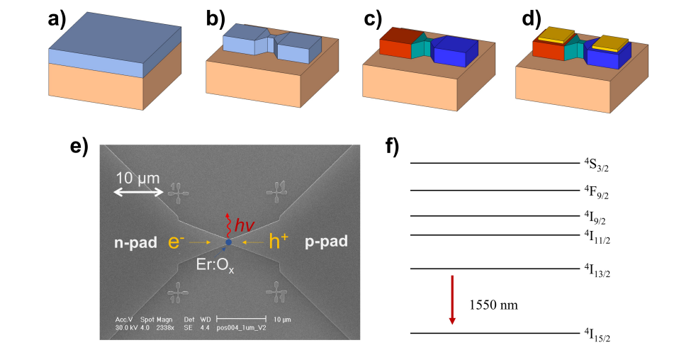 Fabrication and Doping: The devices are created using a top-down process, including electron beam lithography, ion implantation, and rapid thermal annealing. The erbium doping is combined with oxygen to form Er:O complexes, enhancing the emission yield at room temperature.