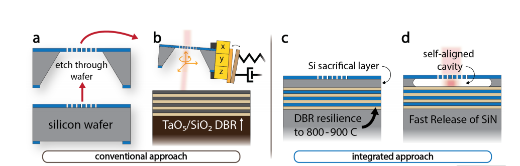 Monolithic Integration of Si₃N₄ and DBR: The main contribution of this work is the development of a monolithic, wafer-level integration strategy that directly suspends high-stress Si₃N₄ membranes above thermally compatible Si₃N₄/SiO₂ DBRs. This integration allows for self-aligned cavities with sub-micron gaps, eliminating the need for delicate bonding or manual alignment. The use of a defect-free amorphous-silicon sacrificial layer and plasma undercut techniques ensures that the cavities are precisely formed.