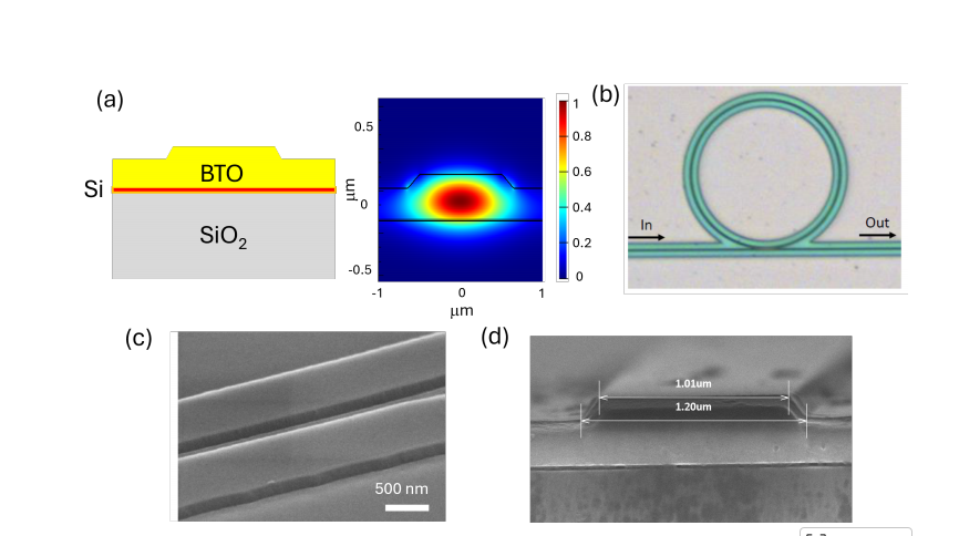Microring Resonator Fabrication: The paper details the fabrication of BTO microring resonators on a BTO-on-insulator platform. The resonators were designed for single TE-mode operation at 1550 nm and fabricated with a rib waveguide structure that helps to confine light in the BTO core for maximizing nonlinear effects. The devices were patterned using electron beam lithography and etched using Ar gas in an ICP-RIE chamber.