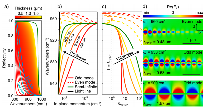 The authors employ scattering-type scanning near-field optical microscopy (sSNOM) combined with nano-FTIR spectroscopy to directly probe SPhP modes at subwavelength resolution. The free-standing membranes allow for reduced damping compared to substrate-supported films, and the AFM tip provides the missing momentum for polariton excitation. Measurements capture complex interference patterns resulting from tip-launched, edge-launched, and multiple reflection pathways of SPhPs. By applying fast Fourier transforms and isolating edge-launched contributions, the in-plane momentum–frequency dispersion is reconstructed. The experimental dispersion matches theoretical predictions, including even (symmetric) and odd (antisymmetric) modes, demonstrating wavelength shrinking and mode splitting as the film thickness decreases.