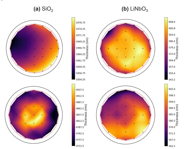 Structural analyses using AFM, SEM, TEM, and X-ray diffraction confirmed smooth, defect-free LiNbO3 films with high crystallinity and uniform SiO2 buffer layers of either 1.9 µm (thin-BOX) or 4.8 µm (thick-BOX), providing high optical confinement. Ellipsometry verified refractive indices consistent with bulk values (n_o ≈ 2.21–2.29, n_e ≈ 2.13–2.21) and high index contrast with SiO2, ensuring efficient waveguiding.
