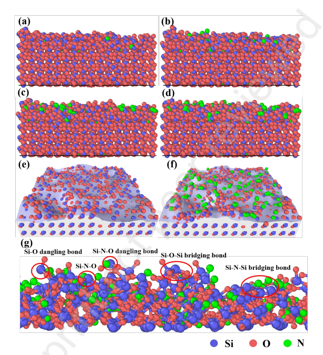 MD simulations demonstrate that N₂ plasma breaks Si–O bonds, forms active dangling bonds (Si–O, Si–N), and promotes adsorption of hydroxyl groups. These changes facilitate strong hydrogen bonding with water molecules, enhancing surface hydrophilicity and interfacial bonding. Excessive plasma exposure, however, induces inactive bridging bonds and surface roughening, reducing bonding efficiency.