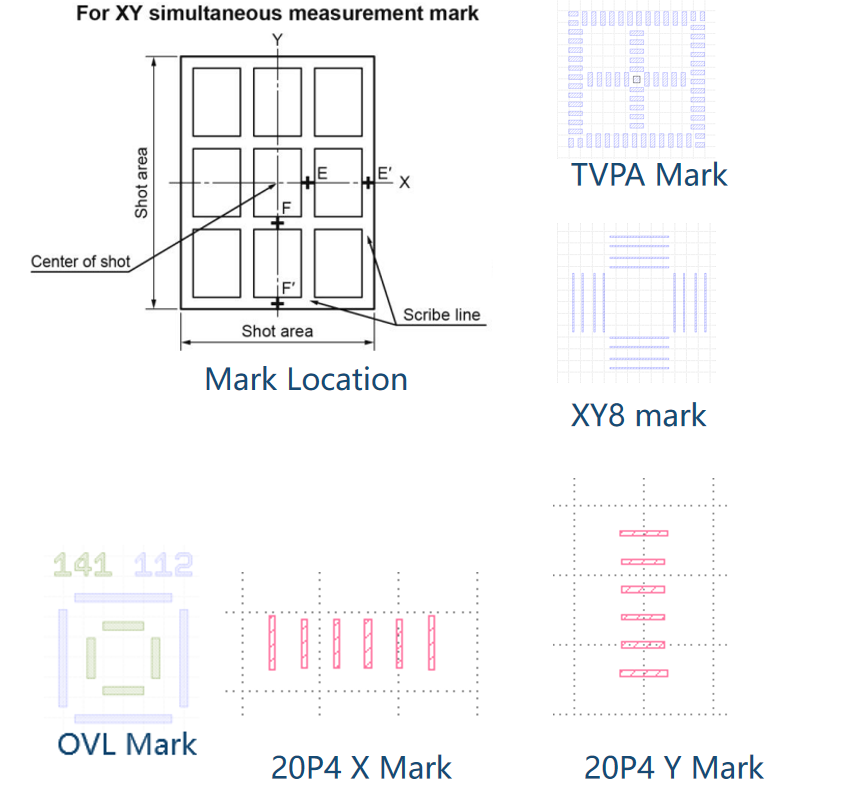 Overlay mark is used to measure overlay accuracy, as shown in the right figure, green is the current layer, and blue is the previous layer (it can be omitted if it is not used to measure overlay accuracy)