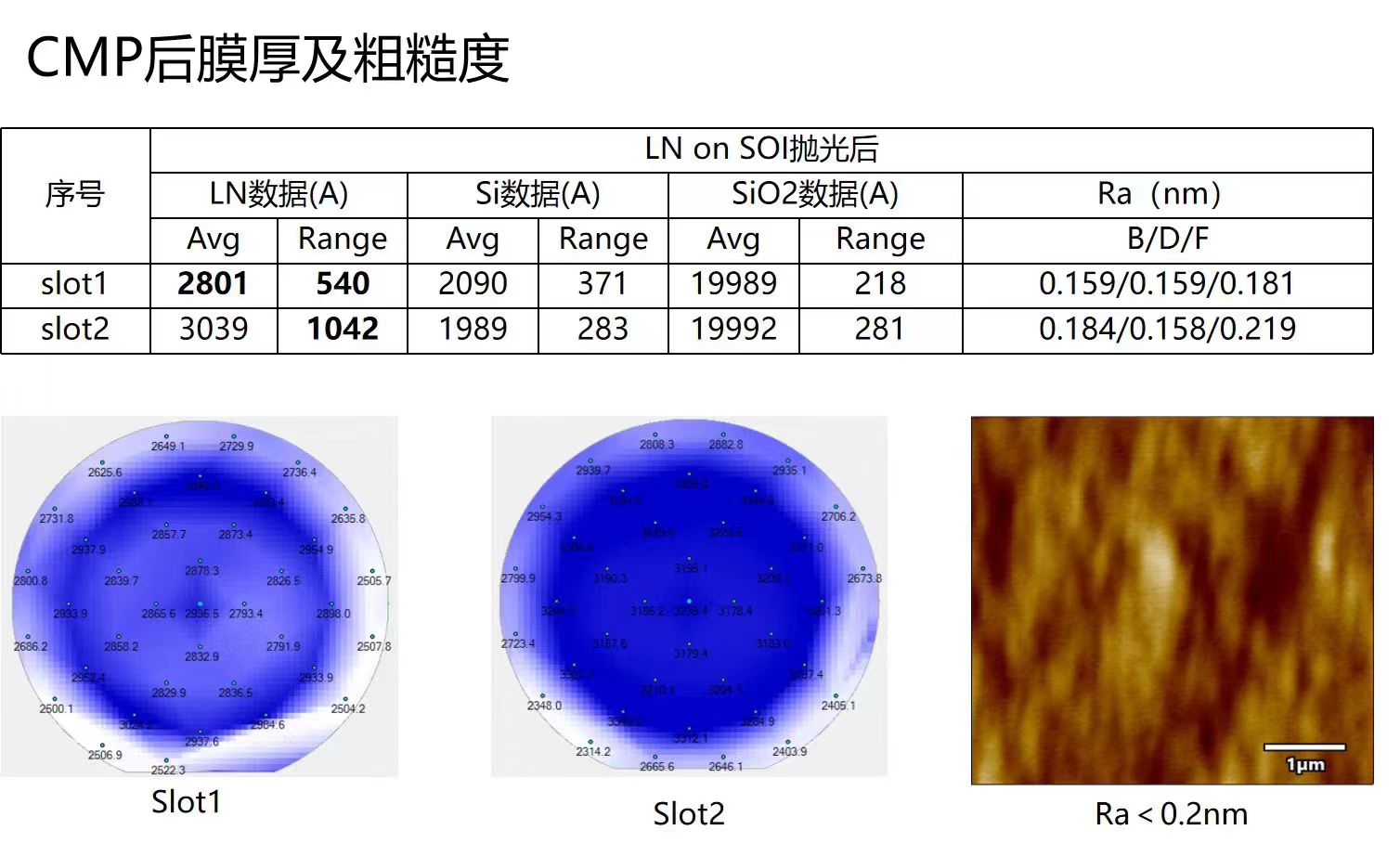 Compared with general LNOI wafer ,we add a innovative process:"Gas Cluster Ion Beam Trimming process " to improve the uniformity(Thickness uniformity Range<57A) of LN thickness and get lower roughness .