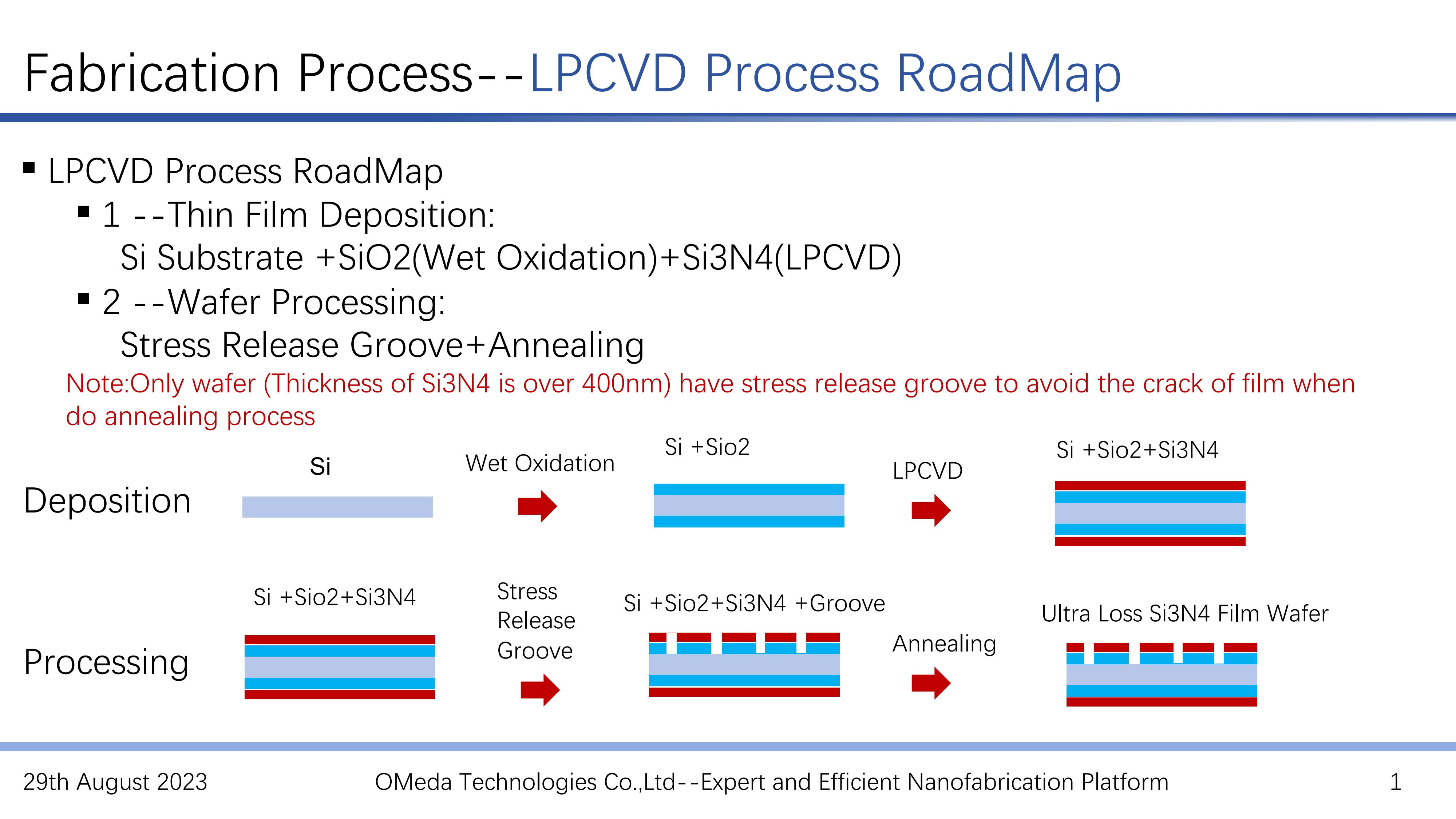 OMedaSemi Provide Low Loss Silicon Nitride on insulator wafer ,we use LPCVD+Annealing to fabricate low loss silicon nitride film wafer .