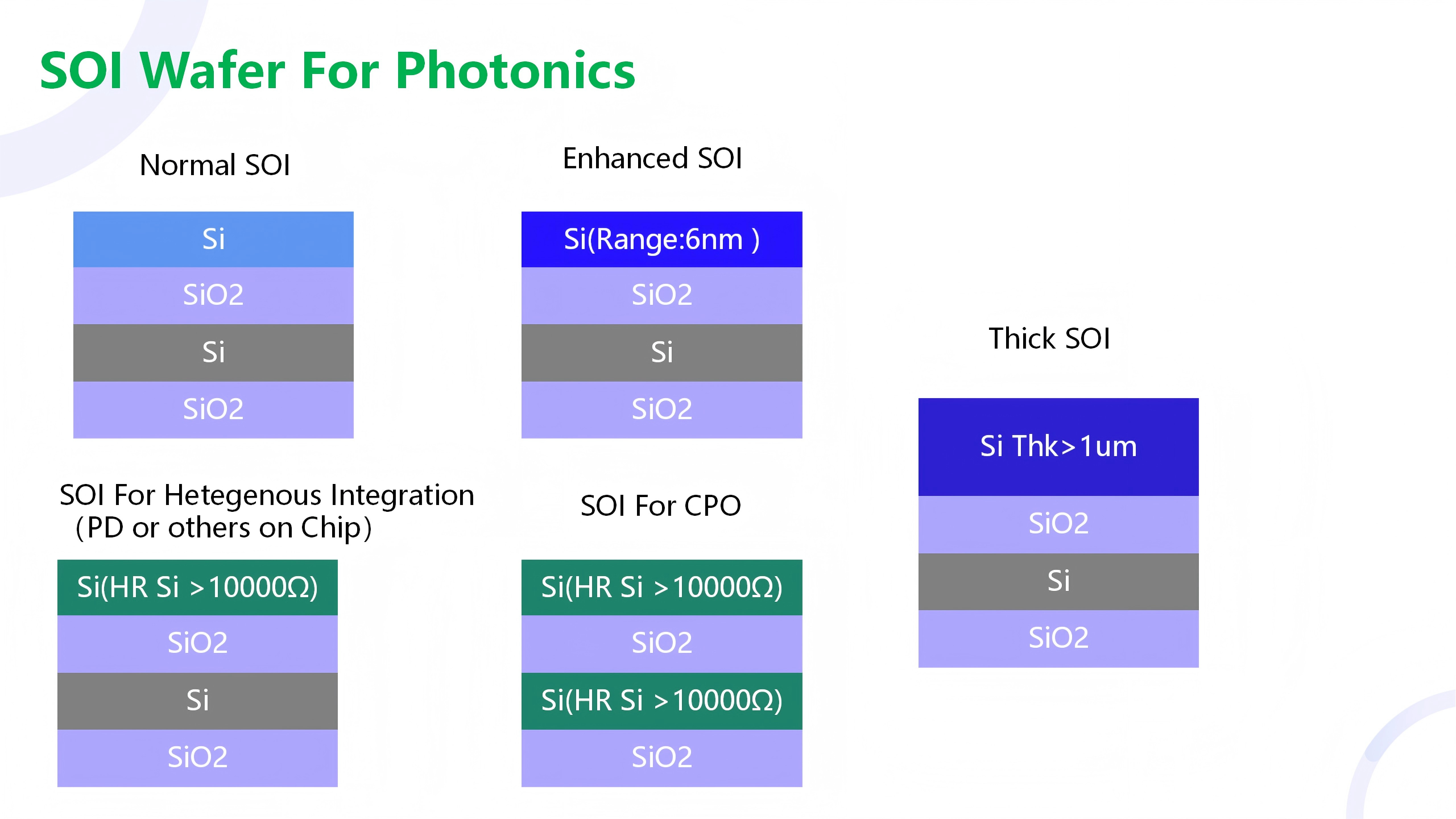 the mostly used is 220nmSi-3umSiO2-525um/675um/725um Si (Thin film silicon photonics) and 3umSi-3umSiO2-525um/675um/725um Si (Thick film silicon photonics) and also other customized spec soi wafer .